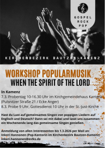 Herzliche Einladung zu unserem beliebten Musik-Workshop! Am Samstag, den 7. März 2026, von 10:00 bis 16:30 Uhr im Kamenzer Kirchgemeindehaus singen wir gemeinsam poppige Lieder auf Englisch und Deutsch. Unter der inspirierenden Anleitung von Inkeri Hannonen, einer talentierten Kantorin aus Finnland, werden wir zusammen proben und am Sonntag, 8. März um 10:00 Uhr, den Gottesdienst in der St.-Just-Kirche musikalisch gestalten.