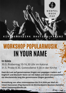 Ein Wochenende mit gemeinsamem Sin- gen und poppigen Liedern auf Englisch und Deutsch! Anmeldung: bis 23. April per Mail